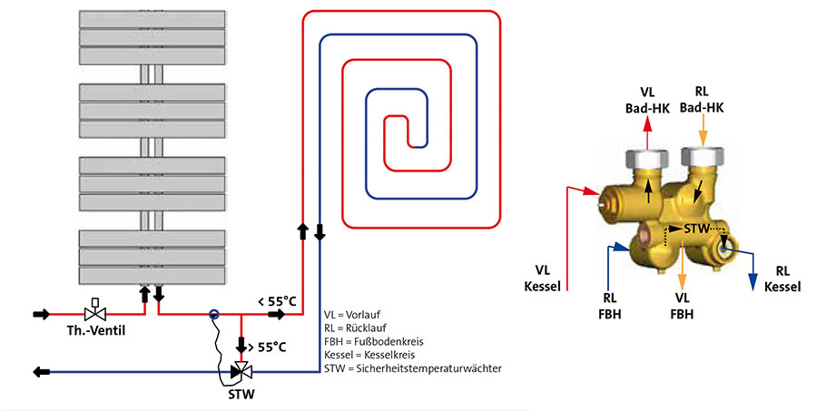 Ohne Heizkoerper brauchst Du zumindest einen Mischer zur Temperaturbegrenzung dazu 65 Grad auf dem Boden kommen nicht so gut. Denn hier sorgen die warmen Boeden fuer deutlich mehr Behaglichkeit und einen hoeheren Wohnkomfort. Dieses Bauteil sorgt dafuer dass beide Heizkreise optimal laufen.
